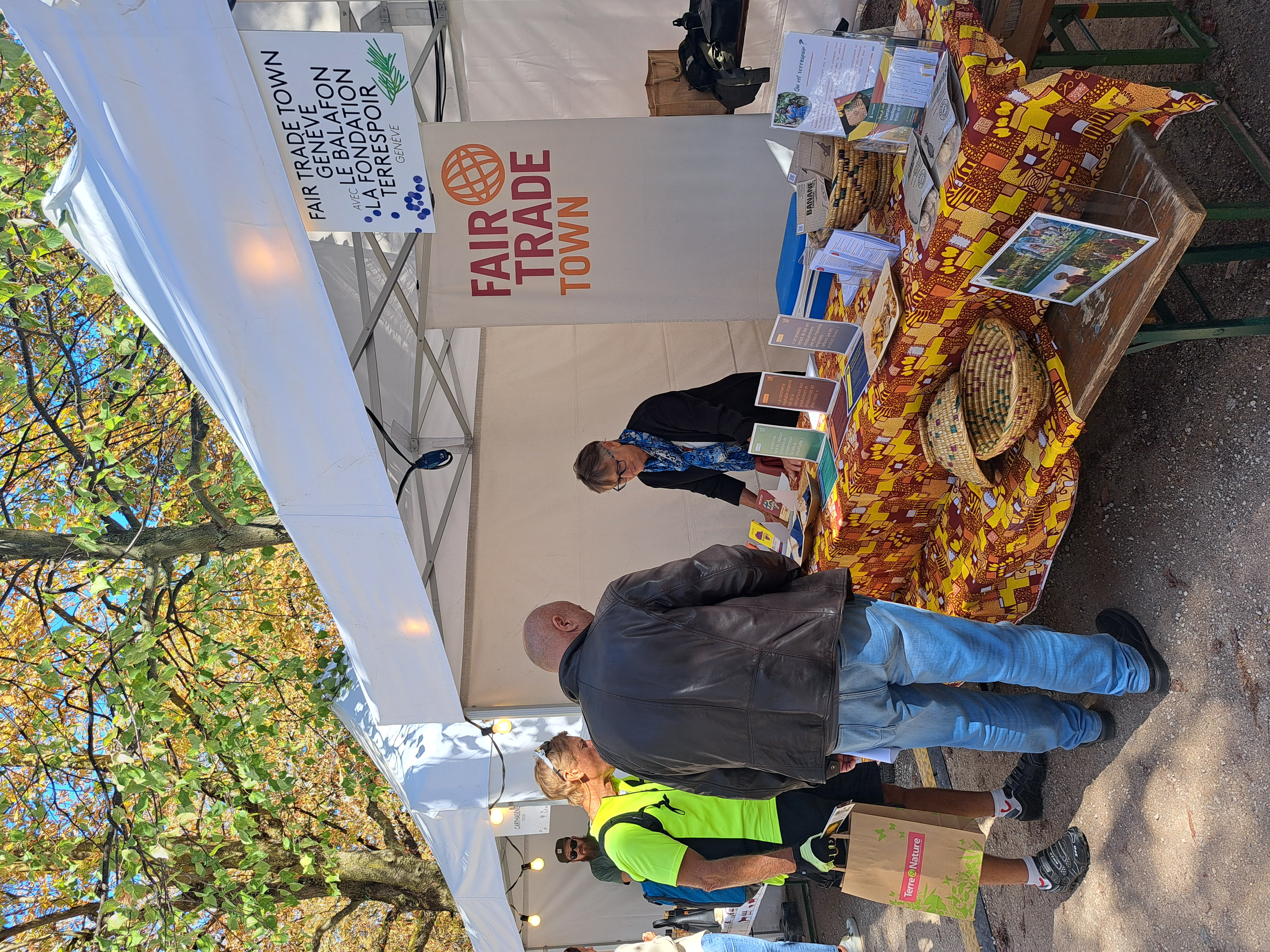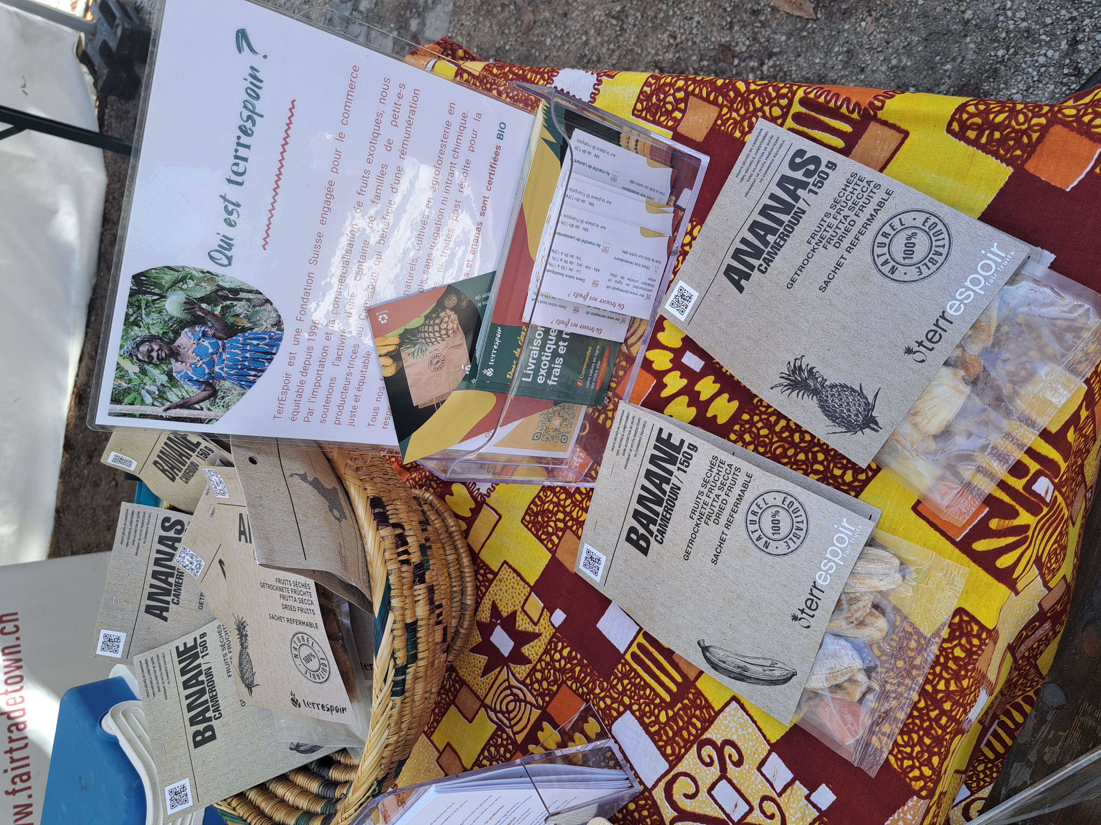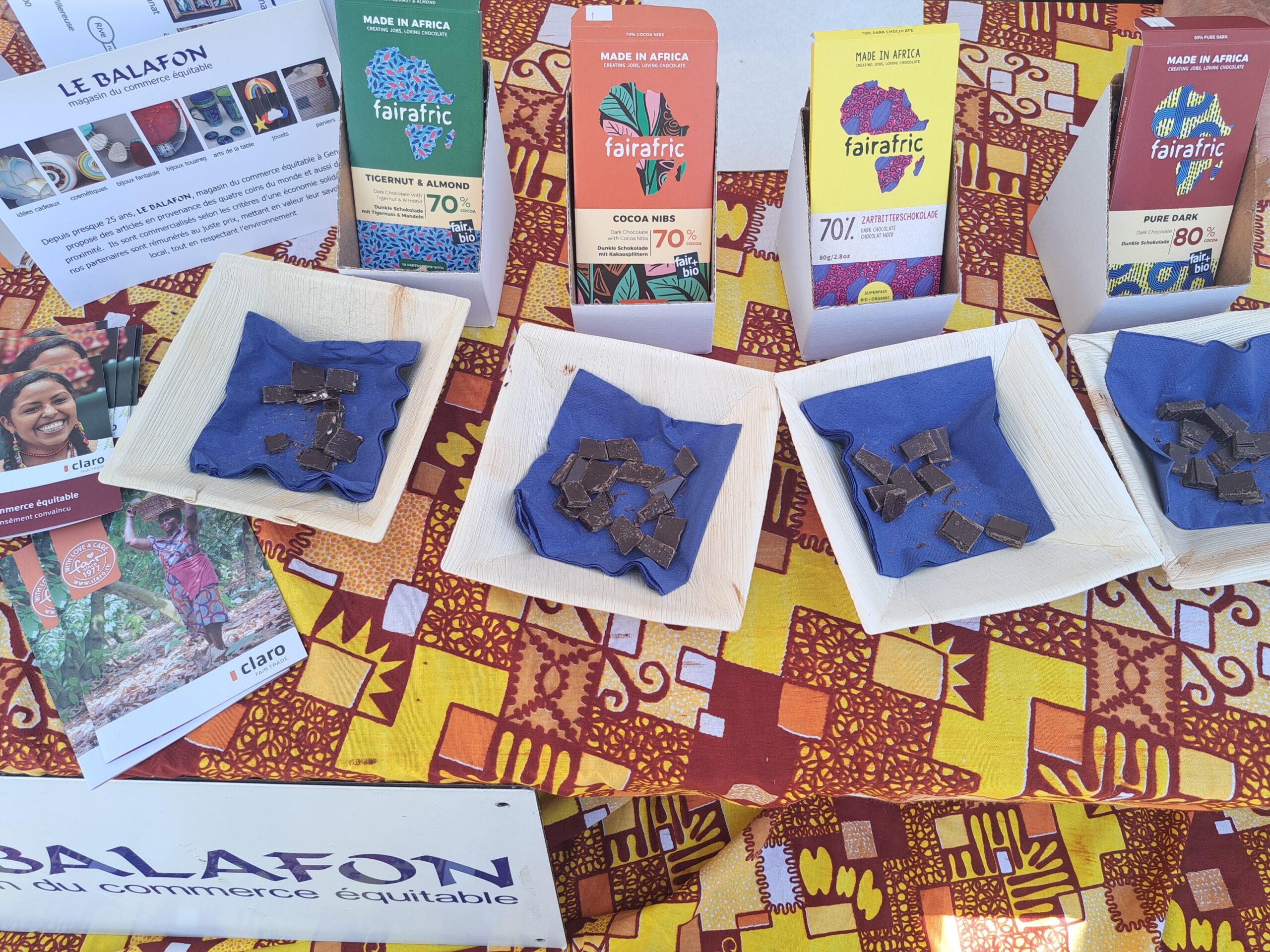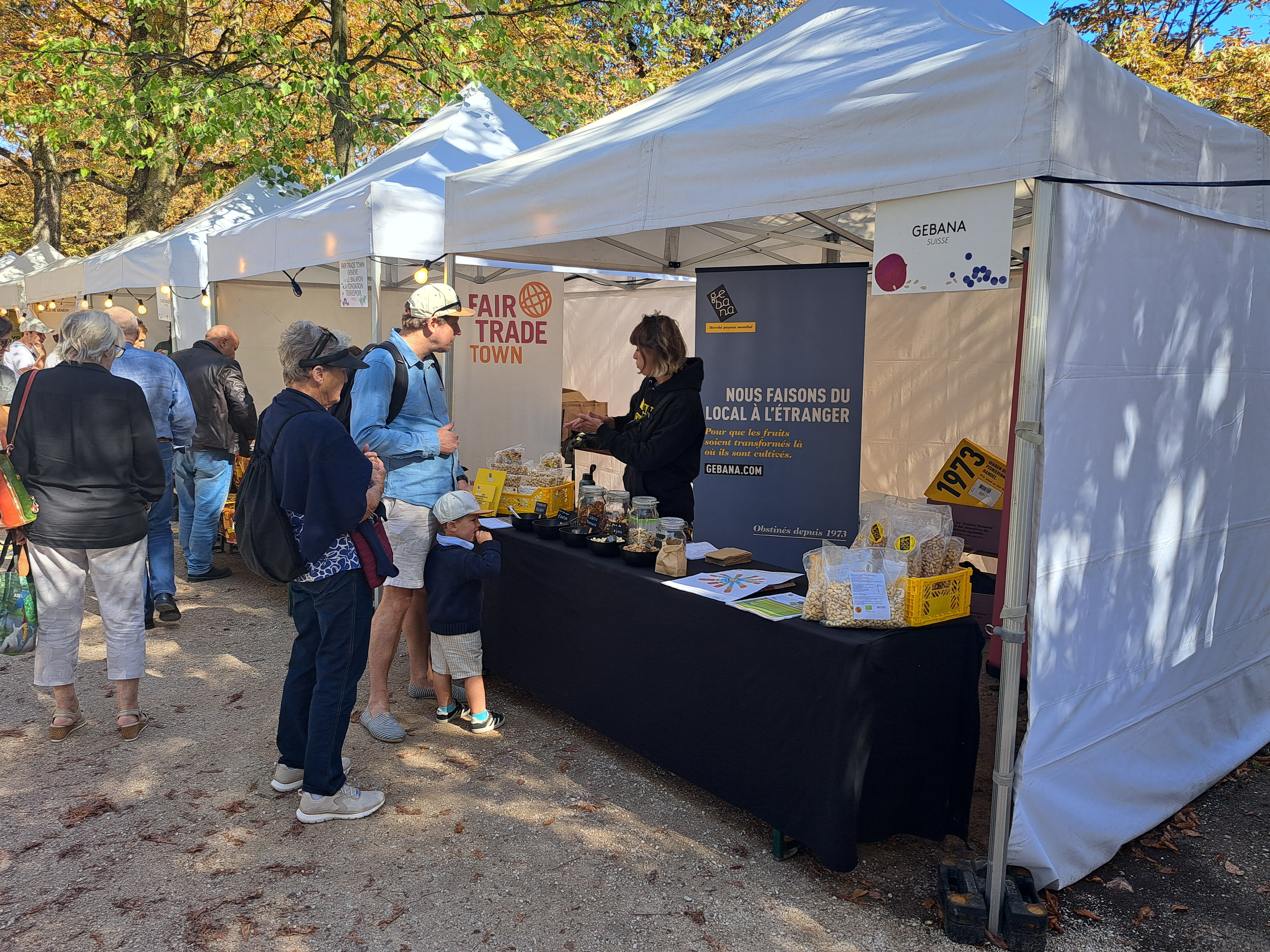 Au-delà du terroir genevois, le commerce équitable international partage une même philosophie : valoriser des chaînes d’approvisionnement plus courtes, plus transparentes et plus justes, qui rapprochent productrices et producteurs de consommatrices et consommateurs. Les bénévoles du magasin de commerce équitable Le Balafon ont présenté sur notre stand les fruits séchés Terrespoir et le chocolat Fairafric, produits entièrement au Cameroun et au Ghana. Ces produits illustrent parfaitement le principe selon lequel la valeur ajoutée reste sur place, offrant aux producteur·rice·s un revenu juste. À côté, Gebana proposait des fruits secs selon la même approche, sous le slogan « nous faisons du local à l’étranger ». Les visiteur·euse·s ont ainsi pu constater concrètement qu’acheter équitable, c’est soutenir des pratiques responsables et permettre aux communautés productrices de vivre dignement.